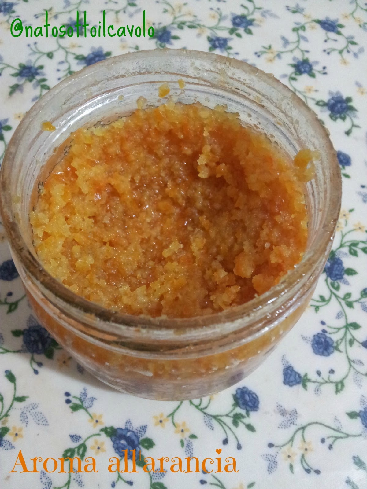 *Volevo farvi vedere cosa uso come aroma all’arancia o al limone: ho la fortuna di poter avere le arance biologiche, conosco la provenienza e il produttore, per cui di loro non butto niente: faccio la spremuta a mio figlio e le scorze le pulisco dai filamenti interni, elimino un poco di parte bianca dentro senza esagerare, le peso e le frullo, riducendole in minuscoli pezzetti, con pari peso di zucchero e invaso. Si mantiene per mesi in frigo ed ogni volta che le ricette recitano “scorza di arancia grattugiata”, io ho la mia in ogni mese dell’anno. La stessa cosa faccio con i limoni facendo però attenzione a togliere meglio la parte bianca per non renderlo troppo amarognolo.